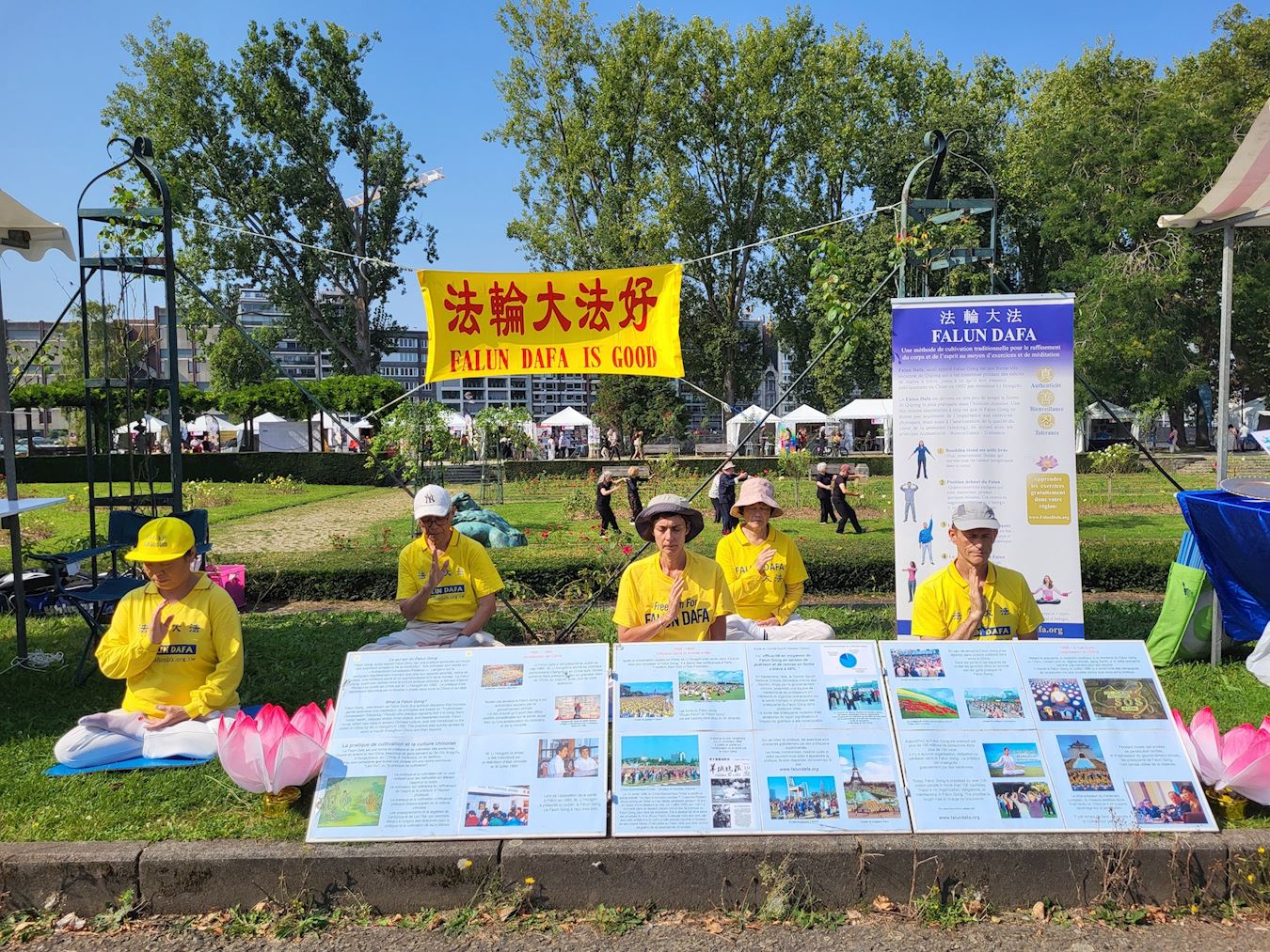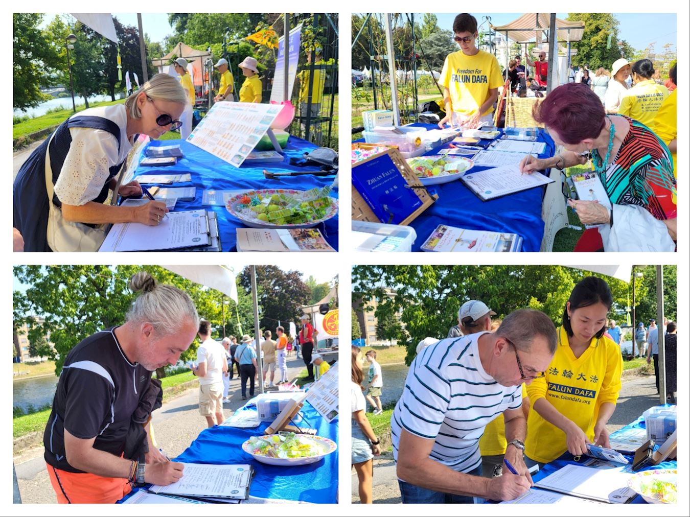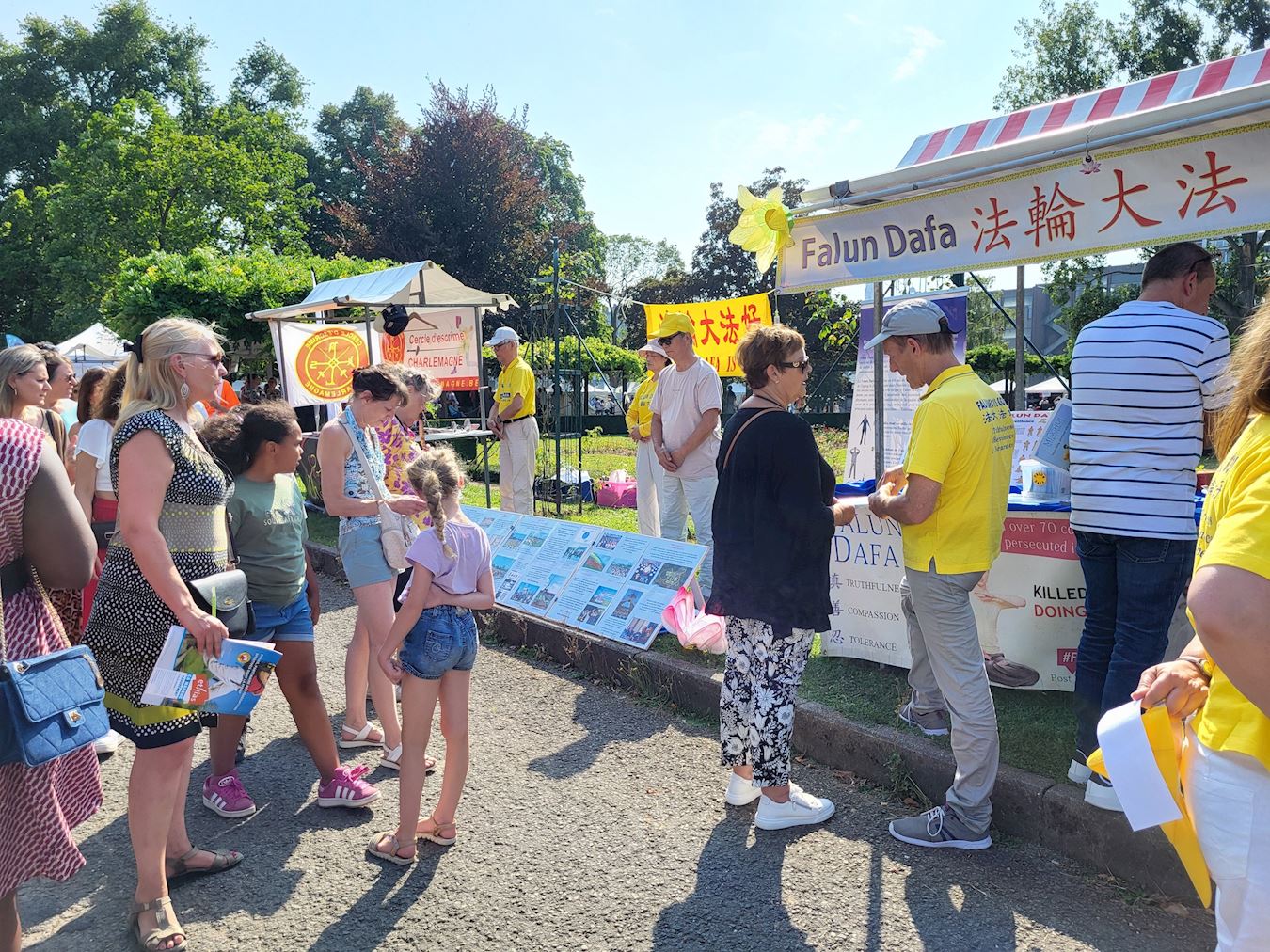 烈日市是比利时法语区最大城市,连接周边城镇有七十万人口。此次参加文化节的协会有二百五十个之多;按照艺术和文化、体育和游戏、健康与福祉、自然与可持续性分区,帐篷排列在道路两旁。此次文化节阳光明媚,有三十多万民众游览文化节。  图4~6:了解法轮功的民众 |