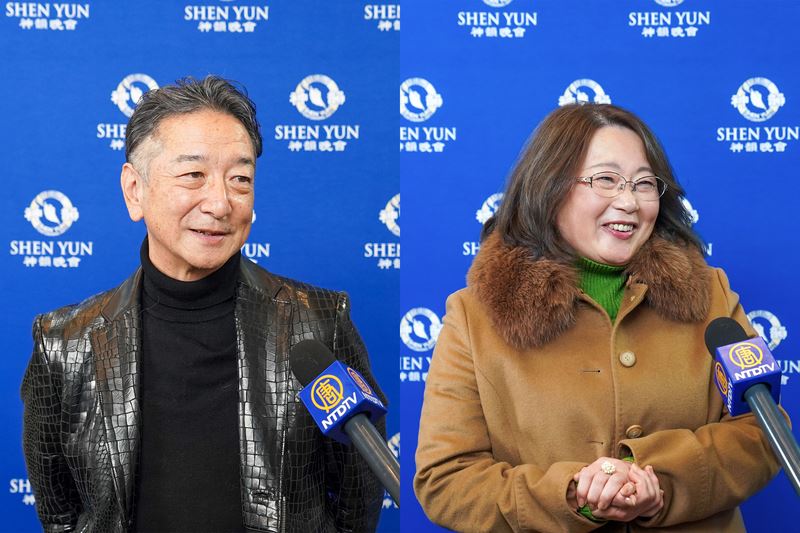 “大幕拉开的瞬间我就流泪了。”楳泽章延(Umezawa Akinobu)震撼不已,“杰作,感动。人生并没有那么多震撼人心的瞬间,今天的我被震撼了。这些演员到底经过了多少万次的排练啊,神韵绝对是必看的演出。一句话,精彩万分。真庆幸今天来看演出,我心中充满感激。” “随着演出的进行,我才明白演出为何是这般设计。最初神佛的降临,开启了后面的故事。看得出这一切都是经过深思熟虑和缜密设计的,怎么能做得这么好呢!所有的一切都很精彩。”他说,“我还看到了这华丽舞台的另一面,另一面就是指让观众倾倒的演员的努力和创意,还有他们的训练成果,这一切我们应该学习的。太厉害了,真的太厉害了,我震撼不已。” 他喜爱所有的节目,尤其对男高音的演唱印象深刻:“歌唱家本身就是乐器。我觉得(歌词)说出了世人都应该遵循的、只要是人就应该去做的事情。” 他对神韵艺术总监表达了由衷的感谢:“庆幸您降临人间,如果他不降临人间,今天的我们就看不到神韵了。由衷的想表达我的感激,想说声:谢谢您。” 董事长夫妇观神韵 看到文化的传承与力量 .纪.元;)'> 图6:二零二五年一月十九日下午,软件开发公司董事长福原良佐(Fukuhara Ryosuke)携太太福原寿美子(Fukuhara Sumiko)一起观赏了神韵环球艺术团在日本东京涩谷公会堂(LINE CUBE SHIBUYA)的第三场演出。(大.纪.元;) |