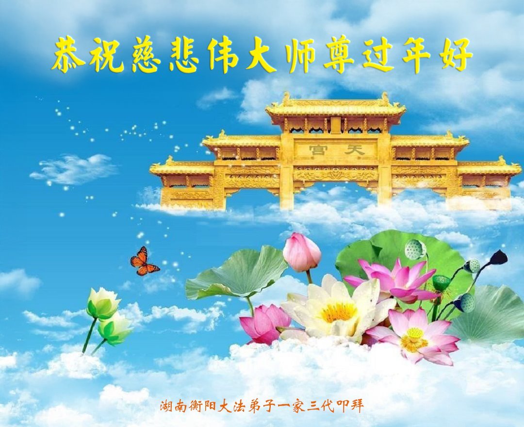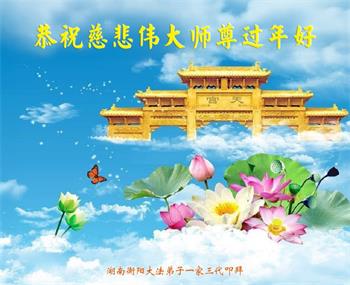 恭祝慈悲伟大的师尊新年快乐! 湖南省岳阳市一大法弟子敬上 湖南省湘潭一大法弟子及家人恭祝师父新年好!