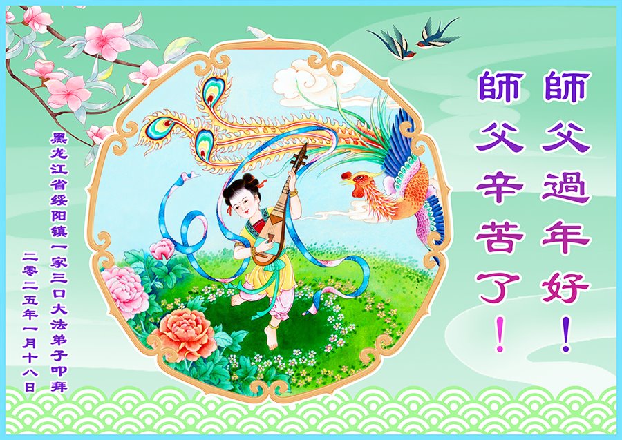 师尊您好,您辛苦了! 为了能让更多的众生得救,师尊用自己巨大的承受与付出一再延续正法结束的时间,等待着众生的醒悟,这是何等的伟大与慈悲啊!在以后的时间里弟子要不断精進,跟上正法進程,做好大法弟子应该做好的三件事。 黑龙江省绥阳镇一家三口大法弟子恭祝师父新年好!