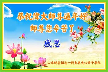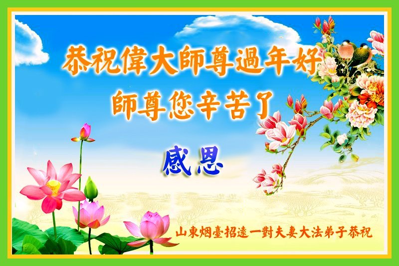 在新的一年里,我要回归大法,重新振作起来,奋起直追弥补自己的不足,多学法,学好法,精進实修,跟师父回家。我发自内心的向师父说声“对不起”,弟子让您操心了,师父您辛苦了!弟子恭祝师尊过年快乐! 山东招远一弟子敬上 山东省烟台市招远市一对夫妻大法弟子恭祝师尊过年好!