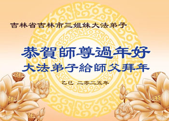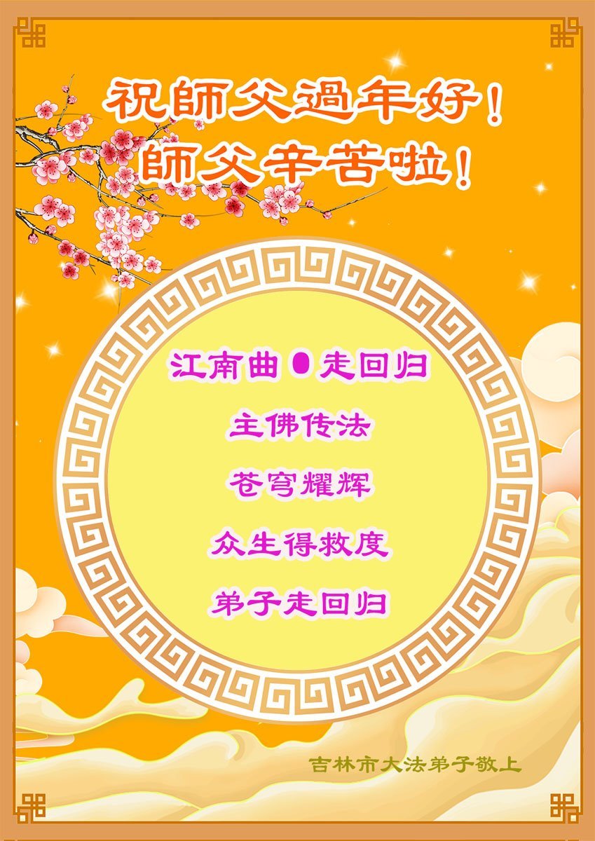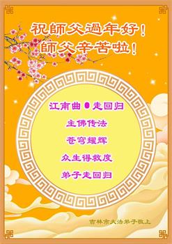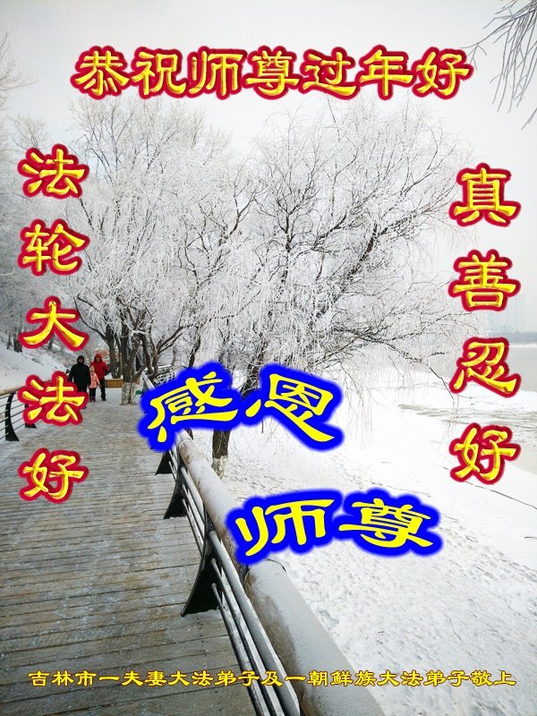 师父您好!阅读明慧特稿〈我们的师父〉不禁泪水涟涟,不知道怎样表达内心的感受,要过年了,弟子给师父拜年,叩谢师尊的慈悲苦度!伟大的师尊过年好!您辛苦了!千言万语也无法表达弟子们对您的感恩,在新的一年里弟子唯有精進以报师恩! 吉林省吉林市一学法小组大法弟子叩首 吉林市一夫妻大法弟子及一朝鲜族大法弟子恭祝慈悲伟大的师尊过年好!