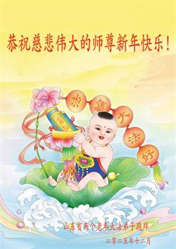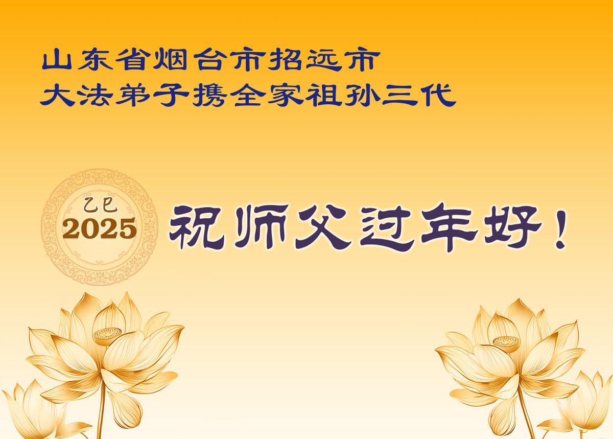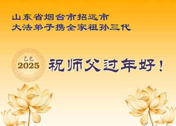 尊敬的师父您好!问一声师父您辛苦了!一年一度的中国传统新年即将到来,恭祝伟大师尊过年好!我们走过风风雨雨二十多个年头了,在伟大师父的保护下,弟子靠信师信法走到今天,也更加清楚作为一名真修弟子有着神圣的使命,多救人,兑现下世誓约。 请师父放心,弟子会坚定的信师信法,助师正法,跟师父走到最后,回到我们自己真正的家园。再次恭祝伟大师尊过年好! 山东省烟台市招远市一位老年大法弟子携全家六人敬上 二零二五年一月十一日 山东烟台招远一老年大法弟子恭祝慈悲伟大师尊新年快乐!