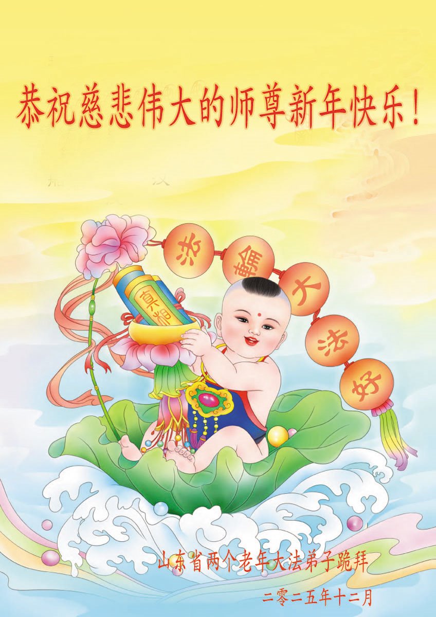 弟子们感谢伟大的师尊!我们坚定正念,学好法,讲好真相,多救人。 山东省两个老年大法弟子恭祝慈悲伟大的师尊新年快乐!