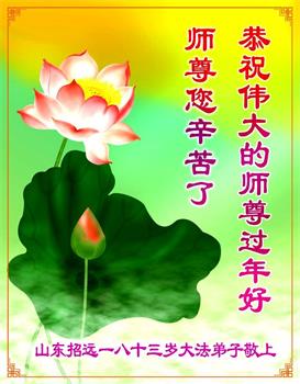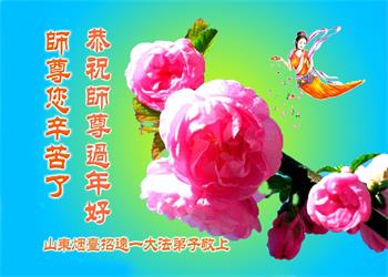 弟子用人间的千言万语无法表达师尊的洪大圣恩。千言万语汇成一句话:好好修好自己,不被邪恶谎言蒙蔽。师父是在为众生承受苦难,师父没有难。现在越来越多的众生觉悟,知道师尊是来传法救人的,都感恩师尊,希望师尊能回中国大陆。在此,弟子代表这些善良可贵的生命谢谢慈悲伟大的师尊!恭祝师尊新年快乐! 山东省烟台市招远市一大法弟子恭祝慈悲伟大的师尊过年好!