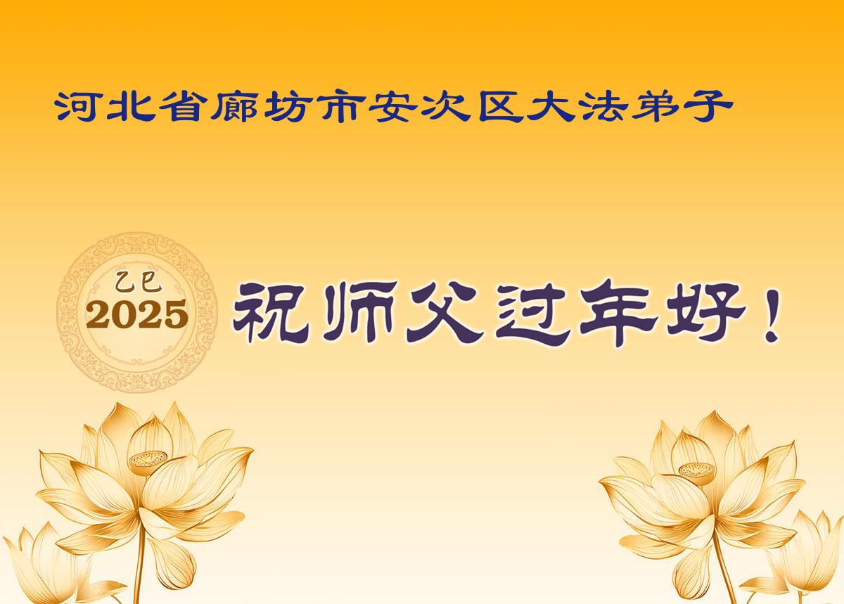 弟子给师父拜年!恭祝师父过年好! 师父辛苦了!谢谢师父给我们延续来的时间,我们要修好自己,同时救度更多的众生。 河北省廊坊市安次区大法弟子叩拜 二零二五年一月十八日 河北省廊坊市文安县全体大法弟子恭祝师尊新年好!
