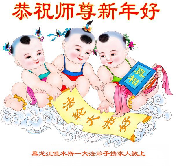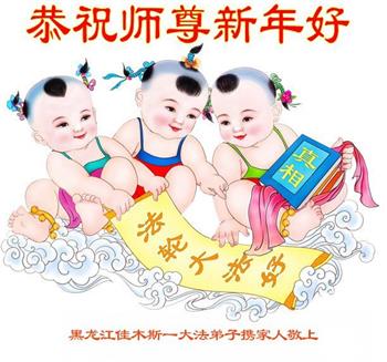 恭祝师尊新年快乐! 黑龙江佳木斯大法弟子敬上 黑龙江佳木斯一大法弟子携家人恭祝师尊新年快乐!