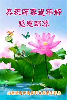 恭祝师父新年快乐! 中国新年到 祝师过年好 隔洋拜师尊 挥毫心意表 法轮大法好 佛光寰宇耀 人类博神怜 师尊威德高 末世红魔闹 砺炼赴场考 知师无苦难 替徒把难消 师恩难回报 为徒泪滔滔 精進再精進 惟愿师尊笑 辽宁锦州黑山县乡村一女大法弟子敬上 山东省烟台招远金岭农村明真相老年夫妇恭祝师父过年好!