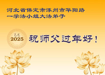 师父新年好!感谢师父慈悲救度。您为所有弟子承受种种魔难、艰辛的付出,我们只有做好三件事以报师恩。弟子恭祝师尊过年好! 河北保定曲阳县一学法小组大法弟子敬上 二零二五年一月二十三日 河北省保定市定州市一学法小组大法弟子祝贺师尊新年快乐!