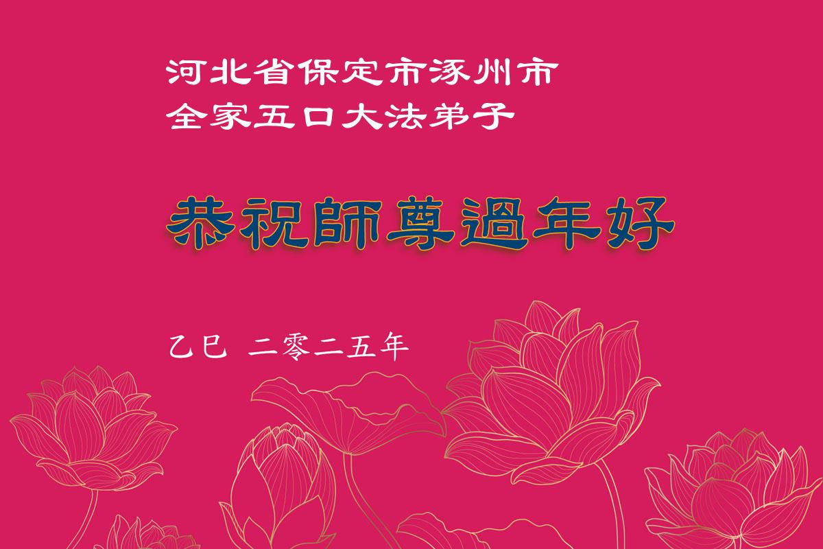 师尊您好,您辛苦了!弟子给师尊拜年,弟子想念您!弟子一定正念正行,多救人。 河北省保定市涿州市全家五口大法弟子恭祝慈悲伟大的师尊过年好!