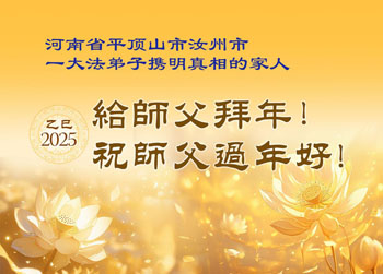 恭祝慈悲伟大的师父新年好! 河南省平顶山市汝州市一大法弟子全家敬上 二零二五年一月十三日 辽宁省辽阳市大法弟子的家属与明白真相的亲属恭祝师父新年好!