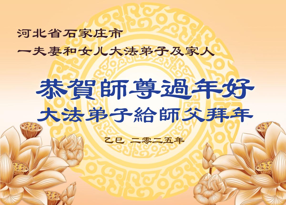 得法二十六年有余,感恩师尊的一路保护!弟子唯有精進报师恩,功成圆满随师还。 河北省石家庄市一夫妻和女儿大法弟子及家人恭祝师父新年好!