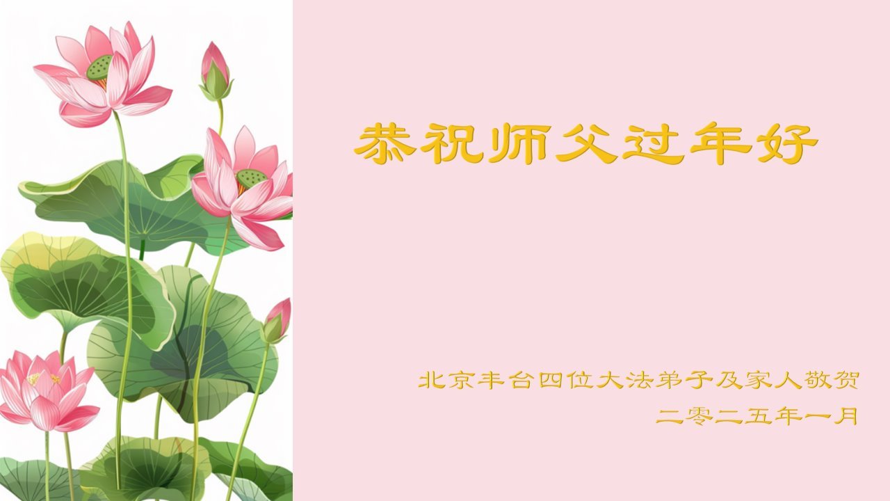 在新的一年,弟子们一定精進实修,做好三件事,让更多众生明白真相,明白法轮大法的美好,恭祝师尊新年快乐!法轮大法好,真善忍好。 北京延庆城区一学法小组全体大法弟子敬上 二零二五年一月二十二日 北京丰台区四位大法弟子及家人恭祝师父过年好!