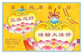 恭祝师尊新年好! 法轮大法好!真善忍好! 北京昌平南口大法弟子敬上 2025年1月23日 北京昌平南口一位女大法弟子率全家五口人恭祝师尊新年好!