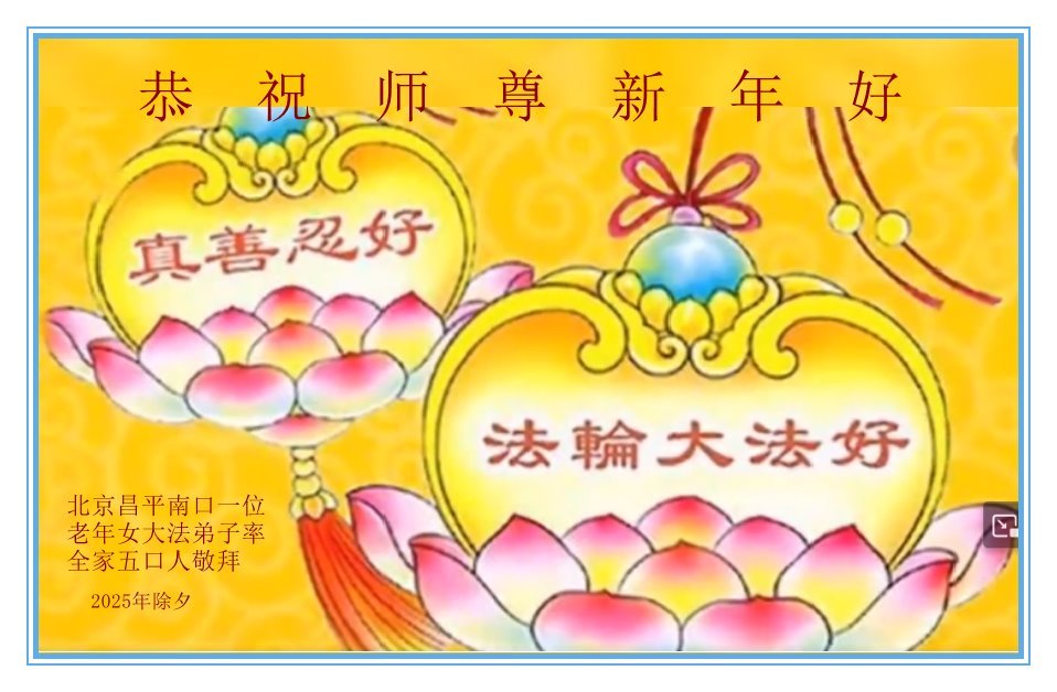恭祝师尊新年好!法轮大法好!真善忍好! 北京昌平南口一位女大法弟子率全家五口人敬上 2025年1月23日 北京昌平南口一学法小组大法弟子及一位家属恭祝师尊新年好!