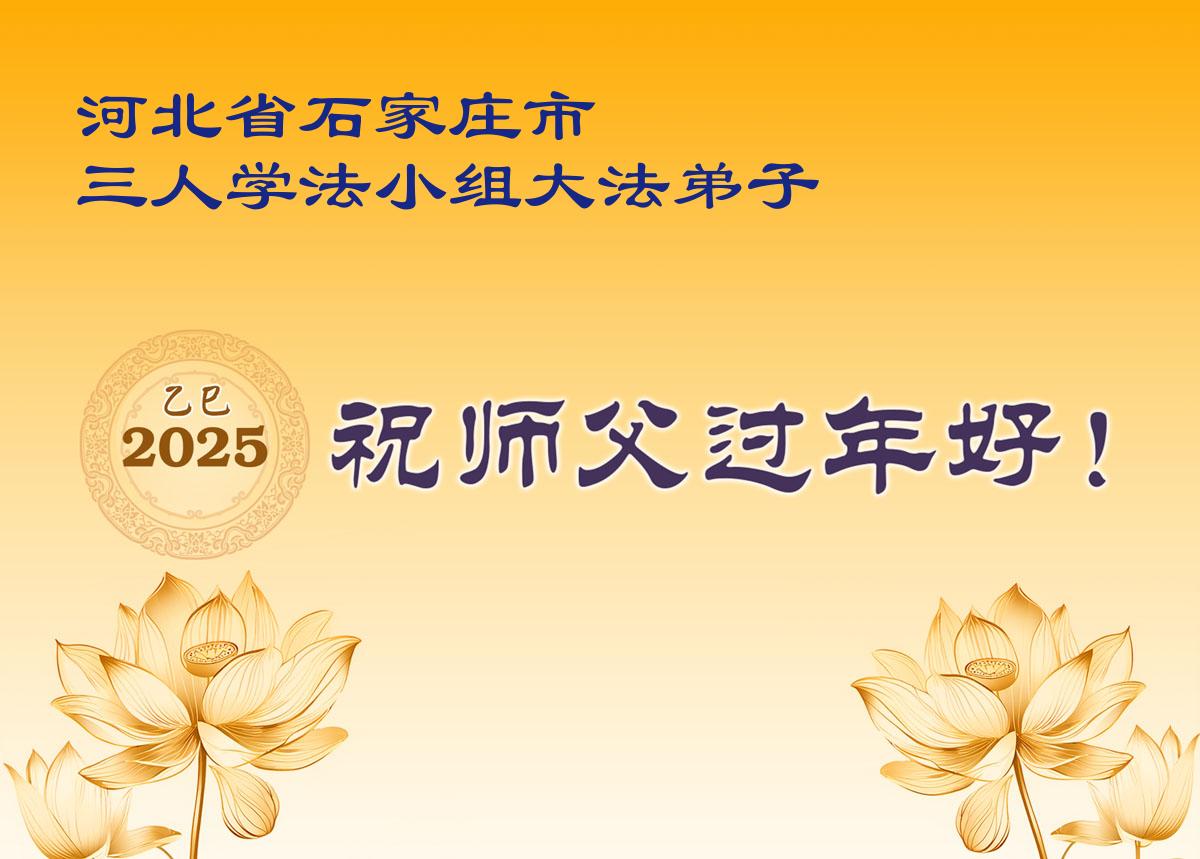 恭祝师尊过年好! 河北省石家庄市三人学法小组大法弟子敬上 二零二五年一月二十三日 河北省石家庄一学法小组大法弟子恭祝慈悲伟大师尊过年好!