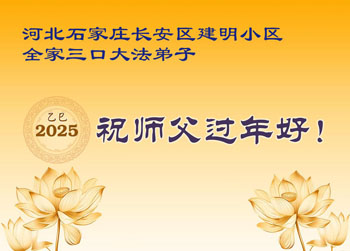 恭祝师父新年快乐! 河北省石家庄大法弟子敬上 二零二五年一月二十三日 河北石家庄大法弟子一家恭祝师尊新年好!