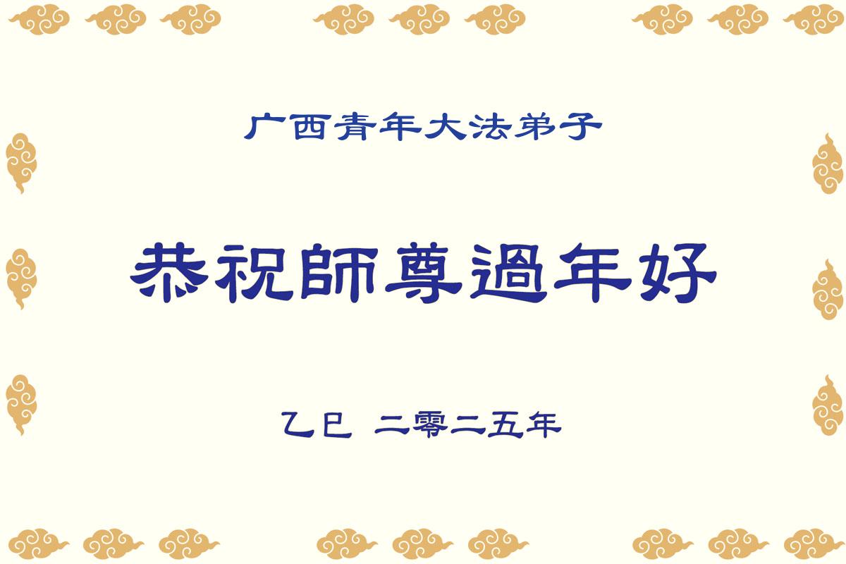 恭祝慈悲伟大的师父过年好! 在师父的巨大付出下,又迎来新的一年,我们要多学法、学好法,多救人,做好三件事。 广西大法弟子叩拜 二零二五年一月十九日 广西青年大法弟子恭祝师父新年好!