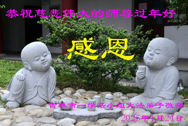 恭祝慈悲伟大的师尊新年快乐! 感恩师尊的慈悲救度!弟子听师父话按照大法的标准要求去做,修成无私无我的正觉! 吉林市大法弟子叩拜 二零二五年一月二十五日 吉林省吉林市一学法小组大法弟子恭祝师尊新年快乐!