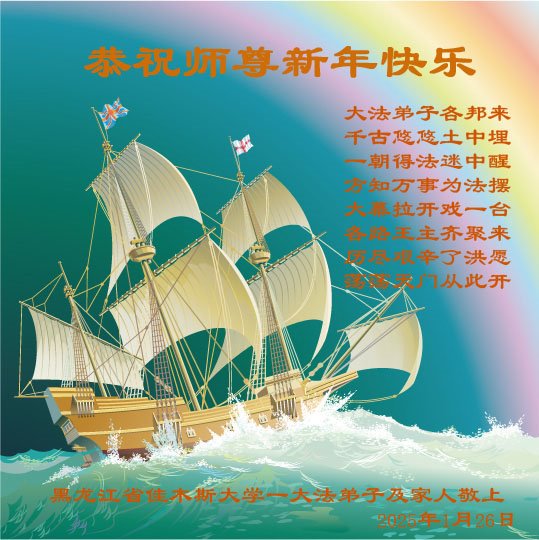 恭祝师尊新年快乐! 大法弟子各邦来 千古悠悠土中埋 一朝得法迷中醒 方知万事为法摆 大幕拉开戏一台 各路王主齐聚来 历尽艰辛了洪愿 荡荡天门从此开 黑龙江省佳木斯大学一大法弟子及家人敬上 2025年1月26日 中国大陆教育系统全体大法弟子恭祝慈悲伟大的师尊新年好!