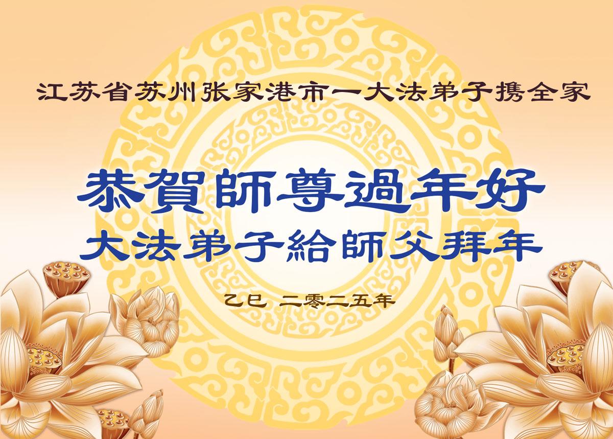 感恩师尊给弟子安排提高的机缘!感谢师父的慈悲救度,在当前的法难中我们要维护好大法,发好正念发挥我们的神通除恶,在新的一年我们要学好法,真修实修自己,救度更多的众生!江苏南京江北二位大法弟子敬上 二零二五年一月二十五日 江苏省苏州张家港市一大法弟子携全家恭祝师尊新年好!