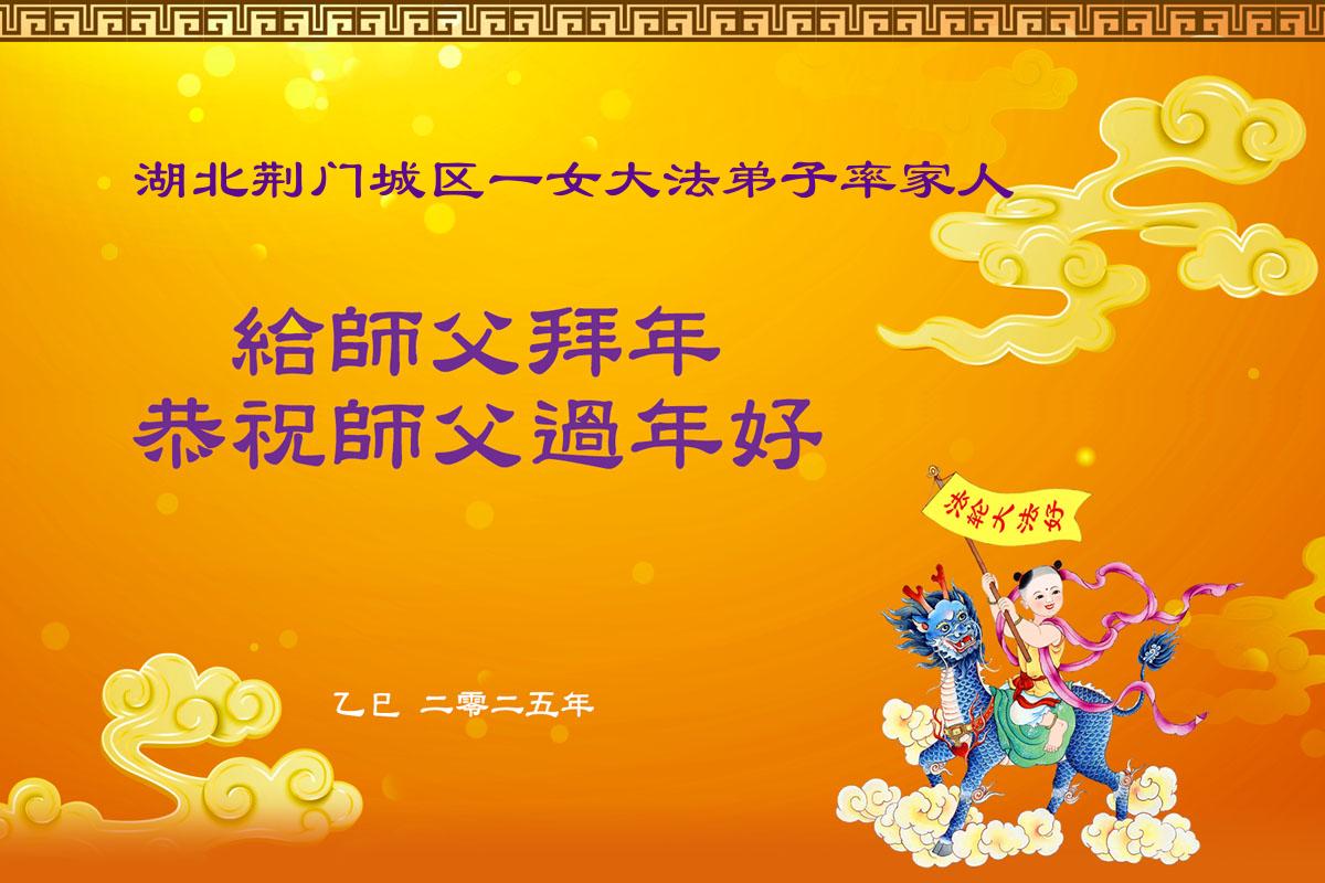湖北荆门城区一女大法弟子率家人恭祝慈悲伟大的师尊过年好!新年快乐!