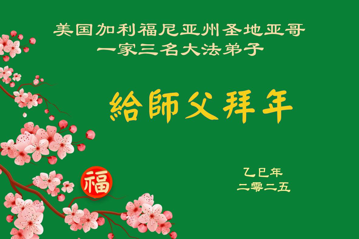 师尊过年好!感恩师尊慈悲救度! 美国圣地亚哥一家三名大法弟子敬贺 二零二五年一月二十六日 美国加利福尼亚州洛杉矶大法弟子一家人恭祝师尊新年快乐!