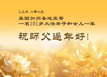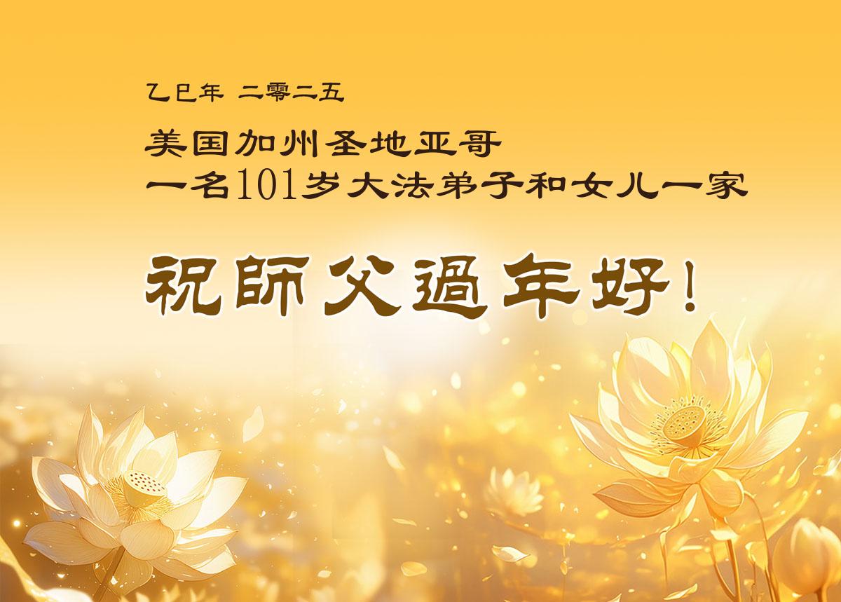 师尊您好!您辛苦了!感恩师父的慈悲救度!给师尊拜年了!恭祝师尊新年快乐! 美国加州圣地亚哥一名101岁大法弟子和女儿大法弟子祖孙三代五人叩拜师尊 美国圣地亚哥两名大法弟子祖孙三代五人敬贺 二零二五年一月二十八日 美国洛杉矶大法弟子恭祝慈悲伟大的师父新年好!