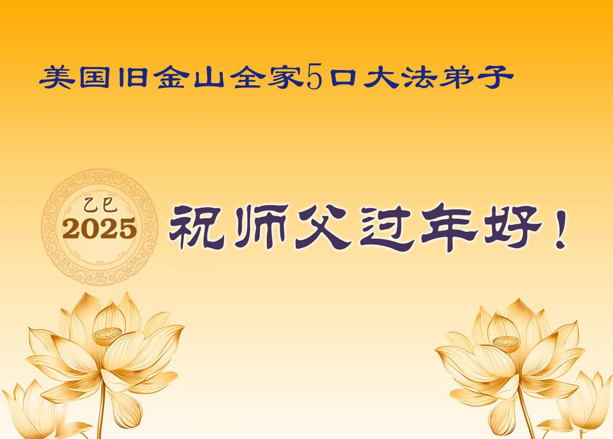在新的一年中,弟子修炼如初,更加精進,让师父少操心!感恩师父的慈悲苦度!恭祝师父新年好! 洛杉矶大法弟子 二零二五年一月二十八日 美国旧金山全家5口大法弟子恭祝师尊过年好!恭祝师尊新年快乐!