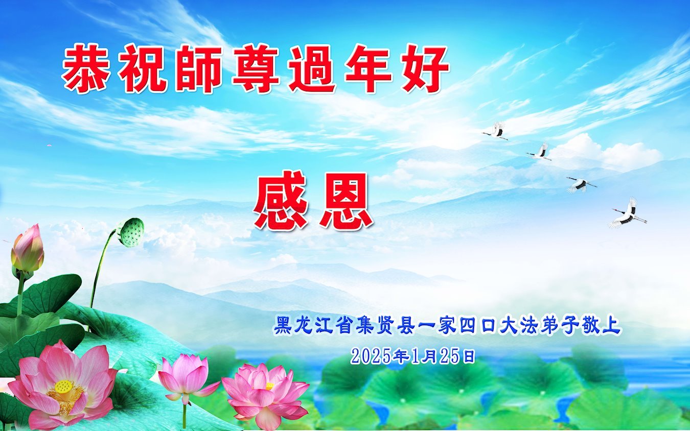 伟大的师尊新年好,新年快乐! 感恩师尊慈悲救度,修炼路上的坎坎坷坷,每一关每一难都在师尊的慈悲保护下才能走到今天,弟子一定要在最后不多的时间里修好自己,努力做好三件事,兑现来世的誓约。师尊您辛苦了! 河北省石家庄市农村大法弟子叩拜 二零二五年一月二十四日 黑龙江省双鸭山市集贤县农村一家四位大法弟子恭祝师父新年快乐!