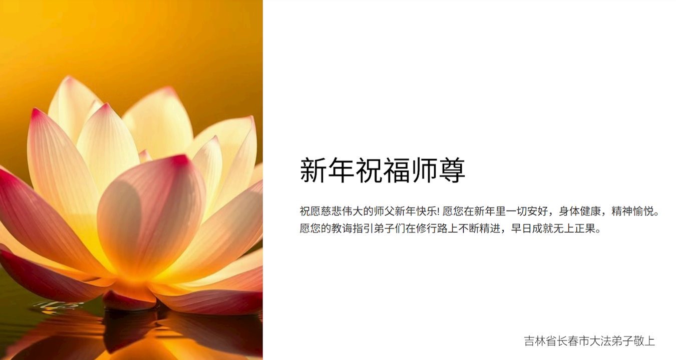 恭祝师尊新年好!感恩师尊慈悲救度!感恩师尊一路保护! 吉林省长春市一大法弟子敬上 二零二五年一月二十五日 吉林省长春市一大法弟子恭祝师尊新年好!