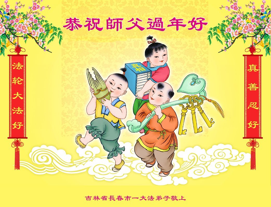 恭祝慈悲伟大的师尊过年好! 叩拜师尊 叩拜师尊 弟子问好 寄语飞鸿 略把心表 法难当前 大法指导 坚修不动 狂风不摇 秉持法宝 溶法内找 查漏去执 亡羊补牢 不畏不惧 等闲笑傲 法徒护法 慈悲永保 法赐神通 洪微横扫 兑现誓约 救众除爪 天地净化 佛光永耀 吉林省长春市农安县大法弟子敬上 吉林省长春大法弟子及家人恭祝师尊新年快乐!
