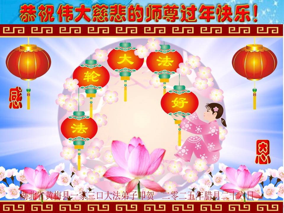 恭祝师尊过年好! 被非法关押在武汉女子监狱的大法弟子敬上 二零二五年一月二十六日 湖北省黄冈市黄梅县一家三位大法弟子恭祝慈悲伟大的师尊过年快乐!