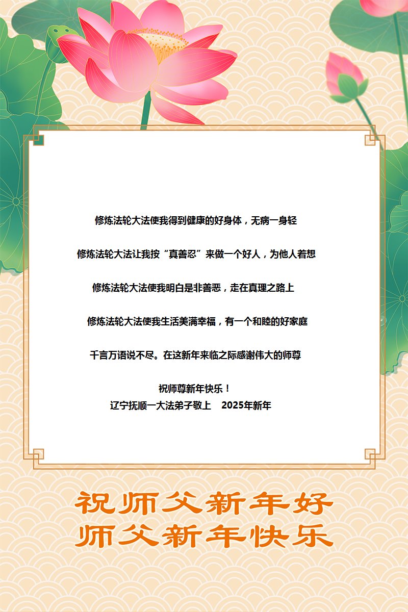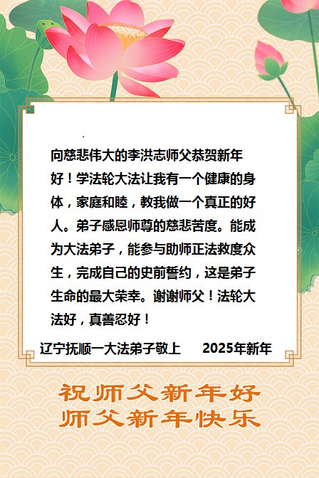 向慈悲伟大的师父恭贺新年好! 学法轮大法让我有一个健康的身体,家庭和睦,教我做一个真正的好人。弟子感恩师尊的慈悲苦度。能成为大法弟子,能参与助师正法救度众生,完成自己的史前誓约,这是弟子生命的最大荣幸。谢谢师父! 法轮大法好,真善忍好! 辽宁省抚顺市一老年大法弟子学法小组大法弟子恭祝慈悲伟大的师父过年好!