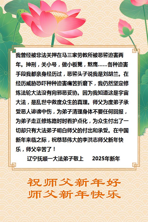 【明慧网二零二五年一月三十一日】 辽宁省鞍山市一家三位大法弟子恭祝慈悲伟大的师尊过年好!