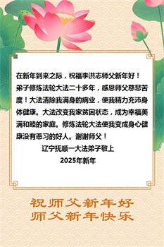 恭祝师父过年好!新年快乐!新的一年里听师父的话,多救人,多发正念。助师正法尽我们最大的力量,让师父多一份快乐!少一分烦恼! 合十 辽宁营口鲅鱼圈一全家大法弟子叩拜师尊 二零二五年一月二十六日 辽宁抚顺一大法弟子向慈悲伟大的师父恭贺新年好!