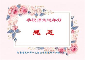在所剩不多的修炼时间里,弟子一定要精進实修,助师正法,兑现誓约,多救众生!弟子感恩师父的慈悲救度,感恩师父一直点悟和鼓励弟子! 河南省许昌禹州市一大法弟子给师父拜年!!恭祝师父快乐!