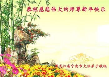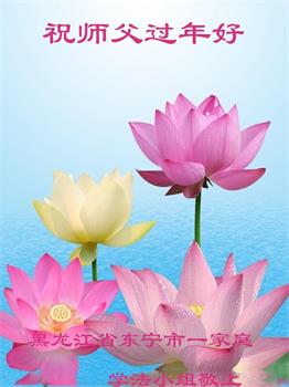 牡丹江市一学法小组的大法弟子跪拜师尊,给师尊拜年!感恩师尊慈悲救度。弟子一定认真学法,同化法,修去执著心,修心向善,多发正念,发好正念。同修相互配合,用不同的形式做好讲真相救人的事,让世人能更多的听到真相。 黑龙江省双鸭山市一大法弟子恭祝师尊过年好!