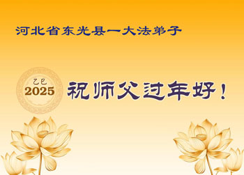 辞旧迎春新年到 弟子感恩问师好 师尊慈悲传正法 洪恩十方救众生 邪恶疯狂来迫害 弟子正念除恶魔 邪灵灭尽正法成, 师尊神威振十方, 祝贺师尊新年好 弟子圆满随师还河北省衡水市景县大法弟子敬上 二零二五年一月二十五日 河北省衡水市景县大法弟子恭祝师尊新年好!