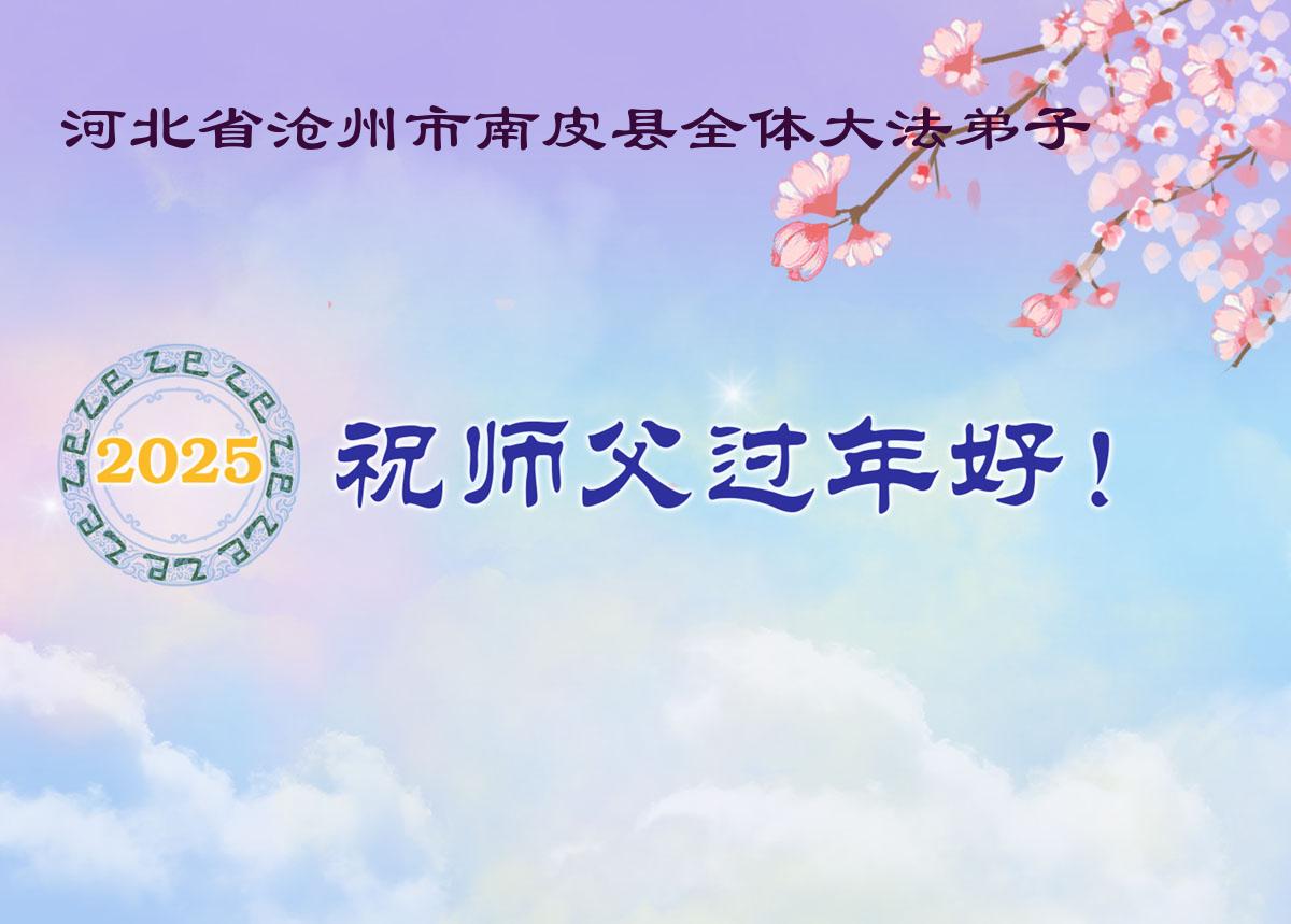 师父:过年好! 师父辛苦了!河北省泊头市大法弟子恭祝师父新年快乐! 人类的历史来到了二零二五年,师父在人中传法已经三十三个春秋,人中的法难已经持续了二十六年,正法已经接近尾声,邪恶的迫害是该结束了!我们会在助师正法的最后时刻,全力清除邪恶,救度众生,走好正法的最后的路程,我们用最好的状态、怀着激动的心情,恭候师父重返中土! 谢谢师父! 合十 泊头市大法弟子敬上 二零二五年一月二十五日 河北衡水大法弟子给师尊拜年,恭祝师父新年好!