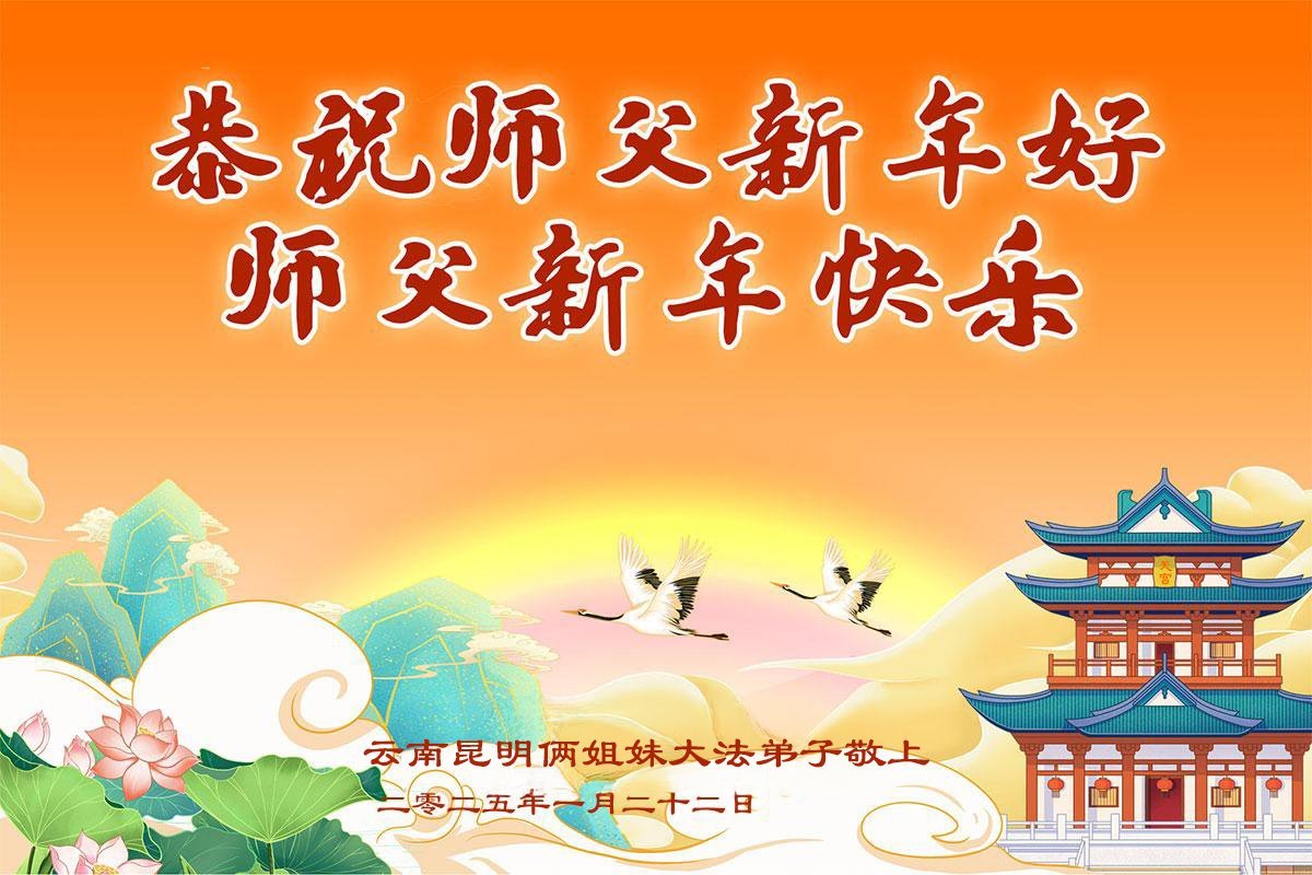 恭祝恩师新年快乐! 慈悲的师父您辛苦了!我们全家感谢您的恩典。敬请您放心,新的一年中,我会更加精進实修,加大力度发好正念,做好三件事。完成我们的史前誓约! 云南昆明一老年大法弟子及家人跪拜 二零二五年一月二十二日 云南昆明俩姐妹大法弟子恭祝师尊新年快乐!