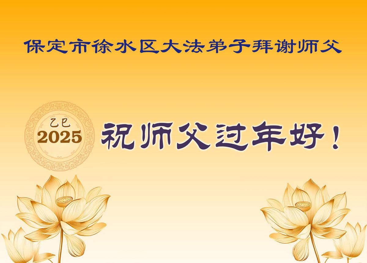 恭祝师尊新年好!弟子给师尊拜年了! 师尊把弟子从地狱里捞起,给了弟子一个健康的身体,指引我、保护我走上了返本归真的回家路!弟子感恩师尊对弟子和家人的慈悲保护!弟子对师尊的大恩大德无以回报,只有听师父的话,精進实修,做好三件事,多救人,跟师父回家! 河北省保定市蠡县大法弟子叩拜师尊 2025年1月27日 河北省保定一大法弟子恭祝师父新年好!