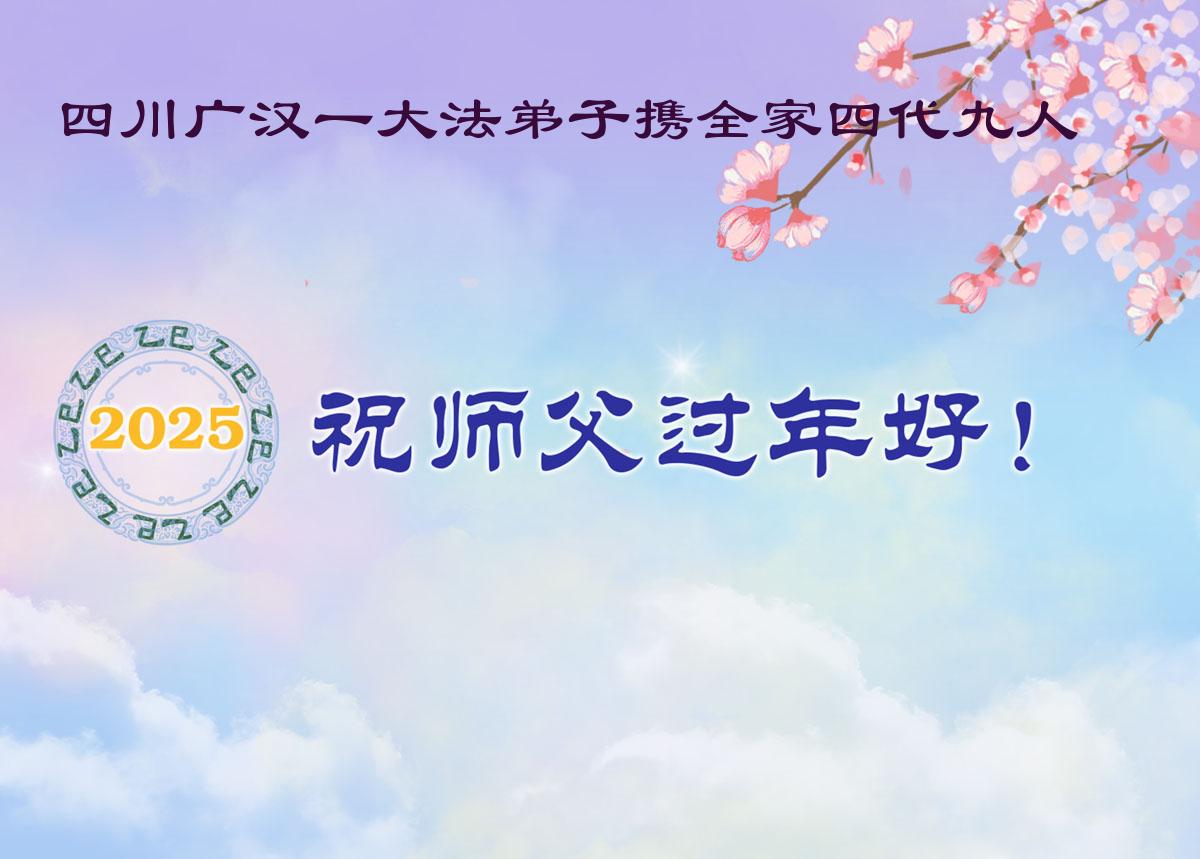 在中国新年即将到来之际弟子及我们全家九人恭祝师尊新年快乐!在新的一年里我们一定会认真学法,认真修炼,做好师父交代的三件事,多救世人,修成无私无我的生命,跟师父回家。 四川省广汉市一大法弟子携全家四代九人跪拜 二零二五年一月二十七日 四川德阳市一大法弟子及家人恭祝师尊过年好!