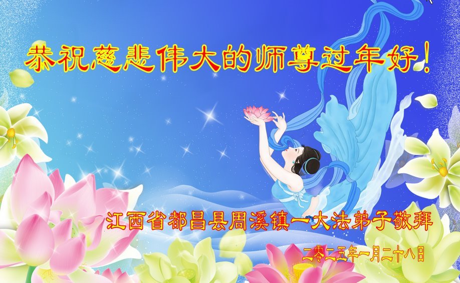 师尊过年好!给师尊拜年了! 弟子感恩伟大师尊的慈悲救度,盼望能早日见到师尊,神韵早日回到中国大陆演出。 南昌县全体大法弟子 二零二五年一月二十七日 江西省九江市都昌县周溪镇一大法弟子恭祝师尊过年好!