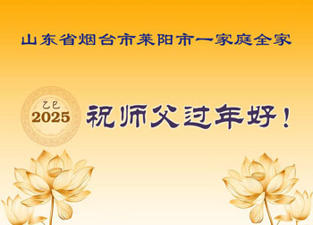 我们是中国大陆山东省大法弟子,在新年即将到来之际,恭祝慈悲伟大师父新年好!新年快乐! 师父您辛苦了!感恩慈悲伟大师父用巨大承受换来的宝贵时间,使弟子得到了多救人,修好自己,建立威德的机会。我们会牢记师父的重托,多学法,学好法,做好三件事,让师父多一份欣慰,少一份操劳,兑现自己的誓约,早日跟师父回家。 希望师父早日回国! 山东省淄博市一家三名大法弟子携家人恭祝师尊过年好!