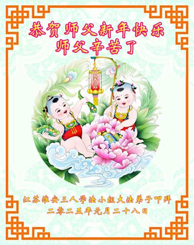 恭祝师父新年快乐!师父辛苦了! 江苏淮安三人学法小组大法弟子叩拜 二零二五年元月二十八日 江苏省南京市一名法轮功学员恭祝师尊新年快乐!
