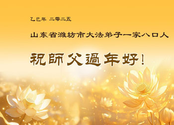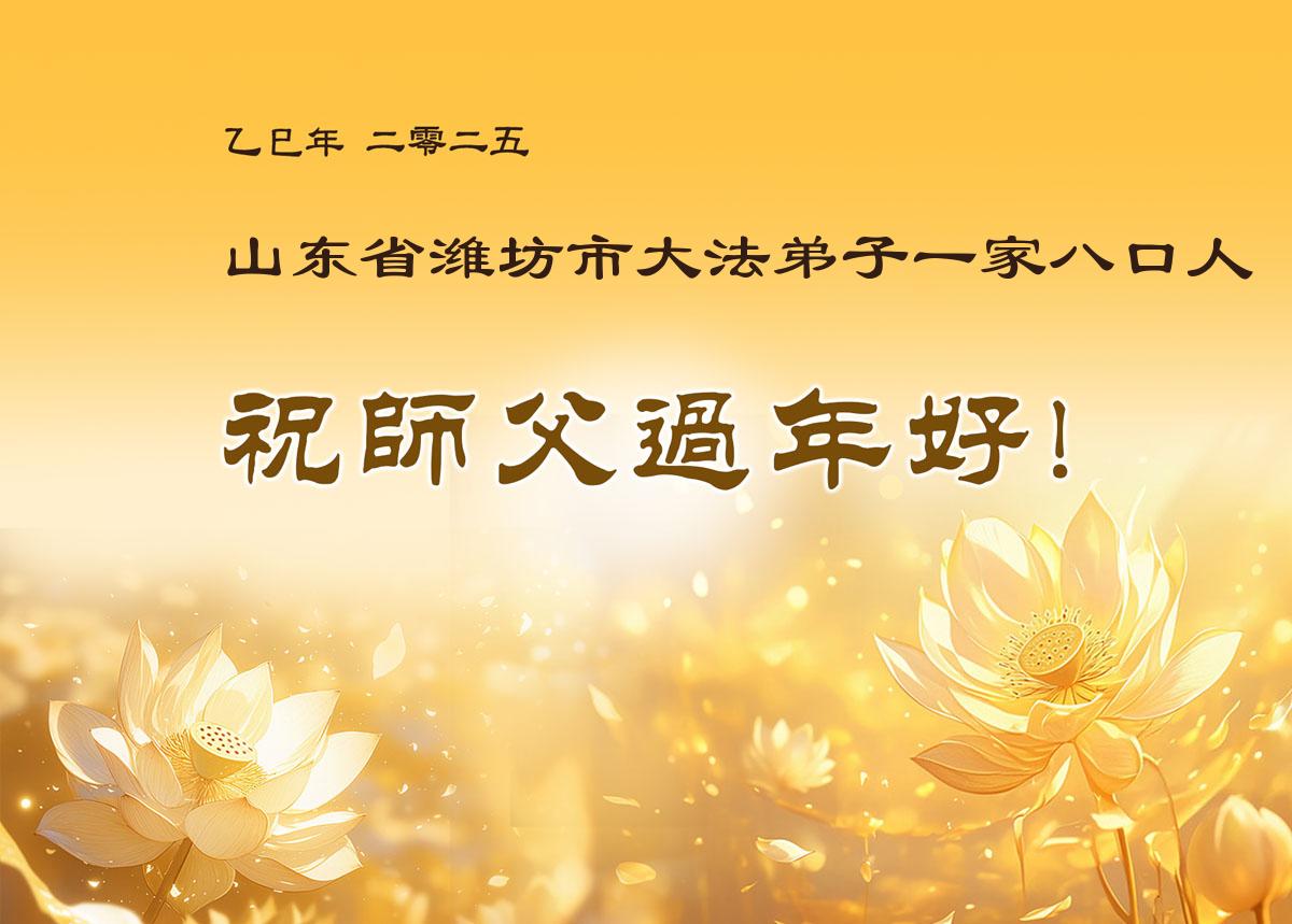 感恩师父慈悲救度!师父辛苦了! 山东潍坊一大法弟子全家敬上 二零二五年一月二十五日 山东省潍坊市大法弟子一家八口人恭祝师尊新年好!