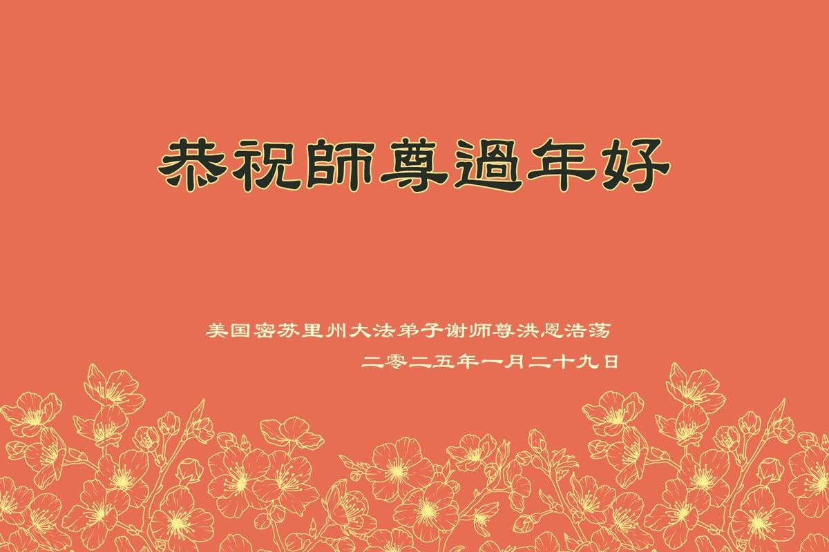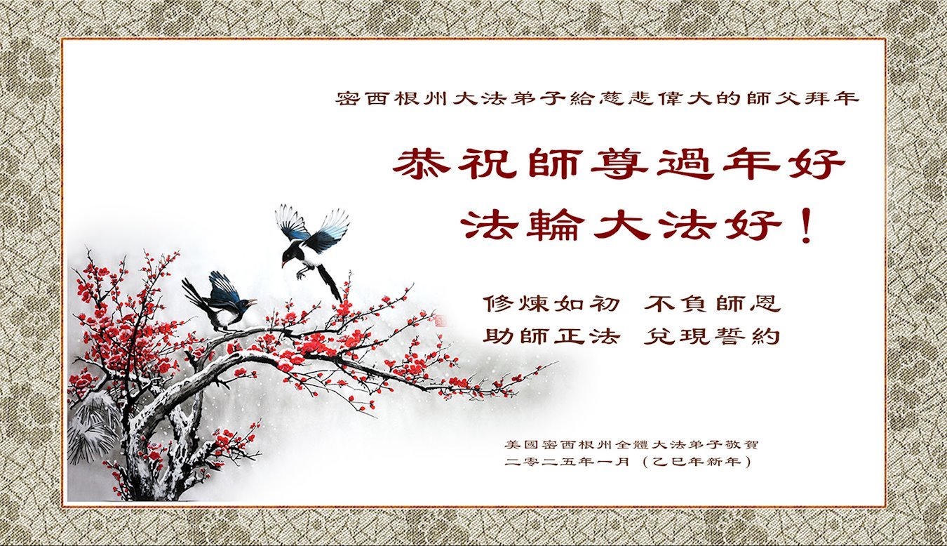 法轮大法好! 真善忍好! 芝加哥及大陆一家五口大法弟子叩拜 二零二五年一月二十七日 美国密西根州全体大法弟子恭祝师尊过年好!