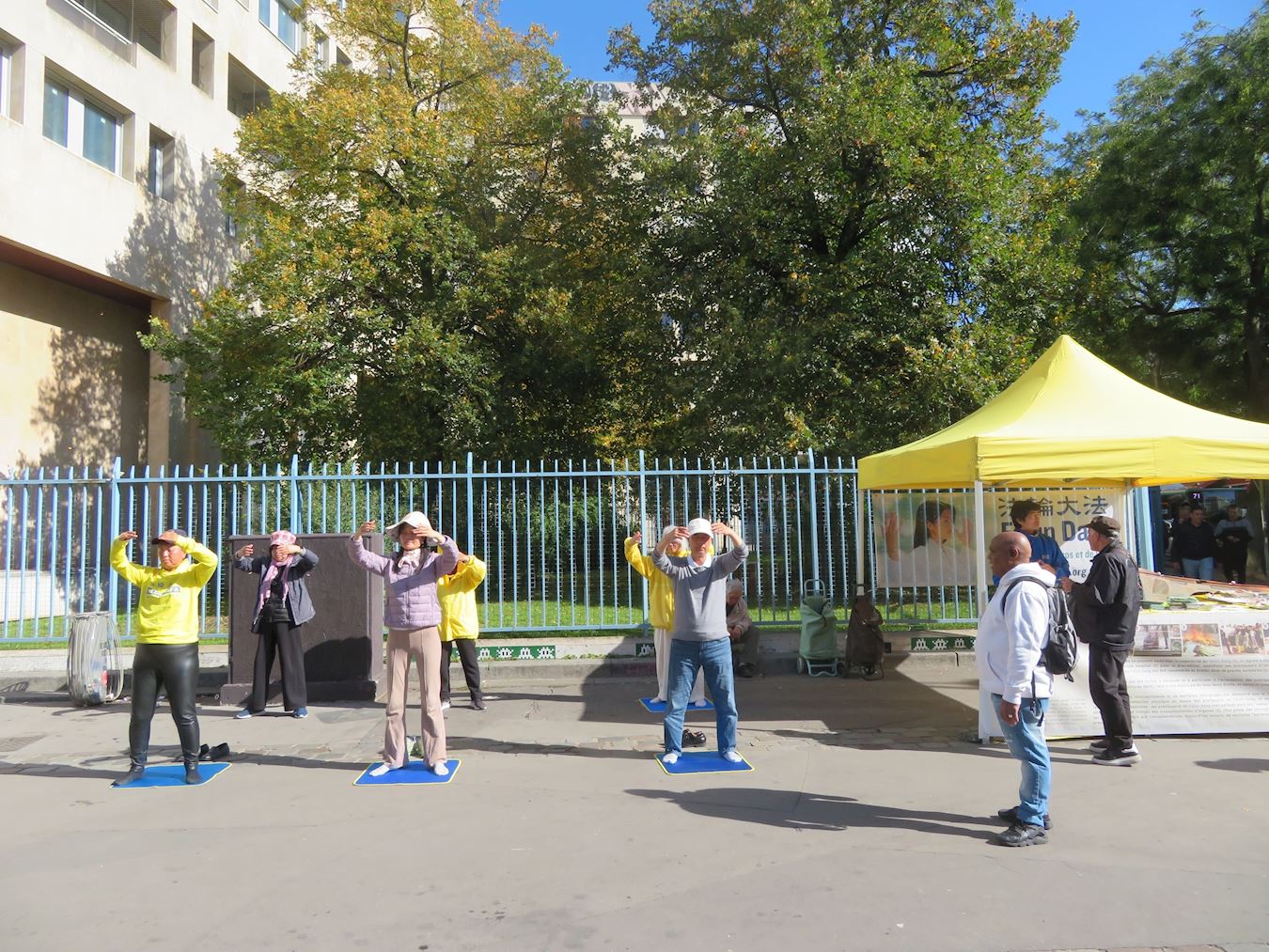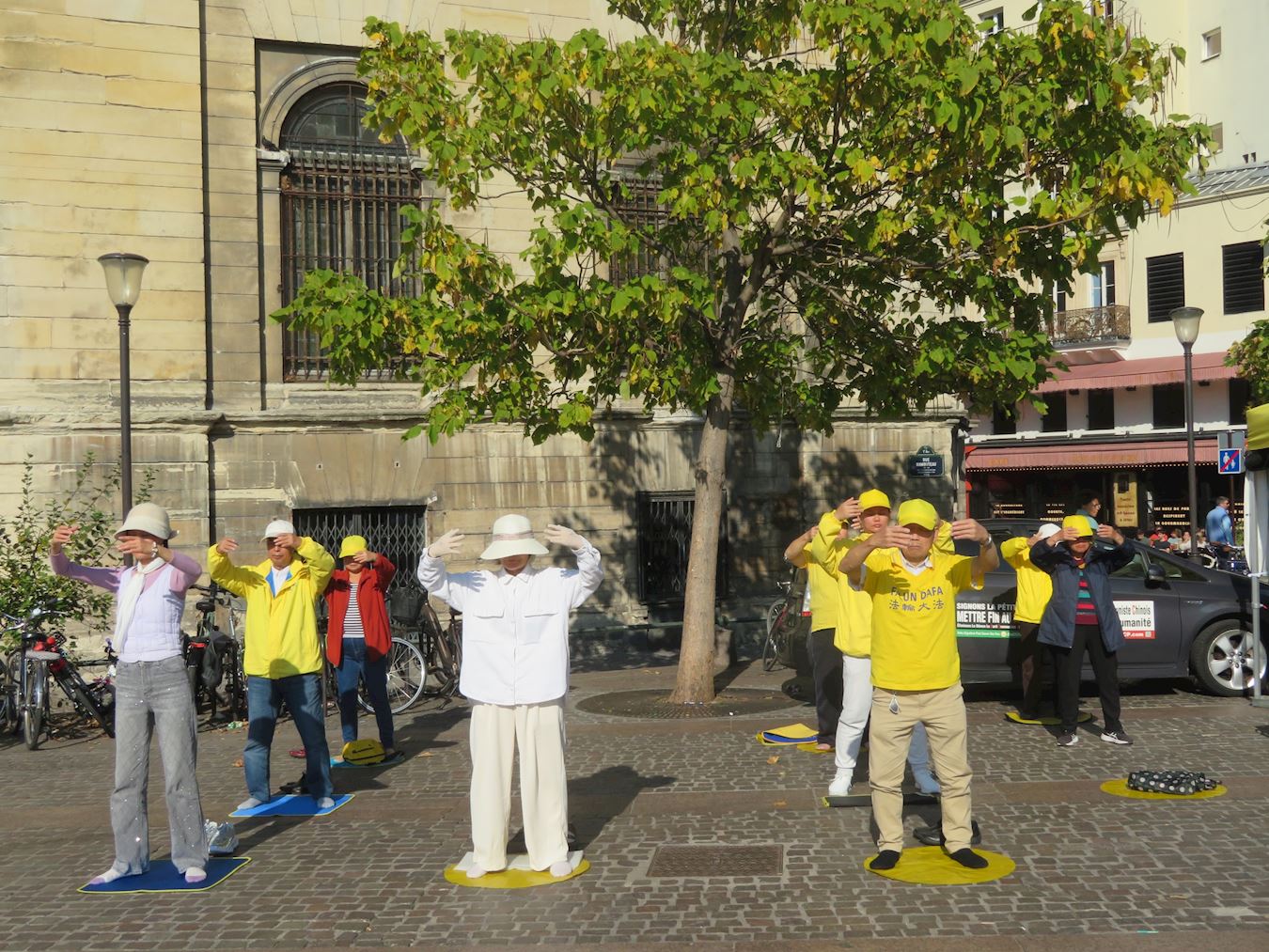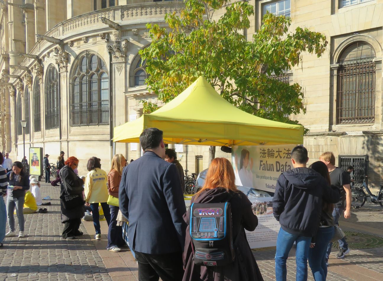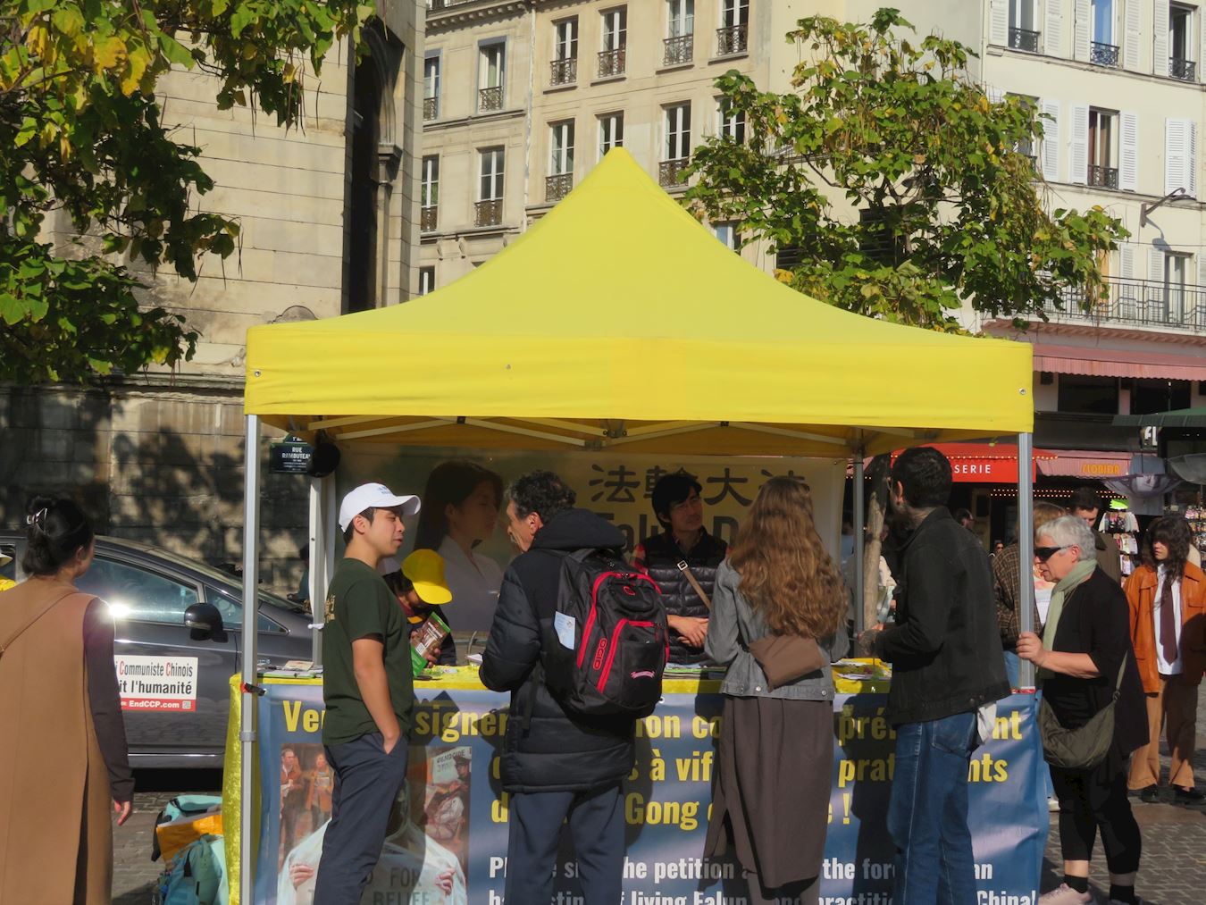 | 【明慧网二零二五年十月十四日】(明慧记者周文英法国巴黎报道)秋天的巴黎,沐浴在金色的阳光里。二零二五年十月七日和十一日,巴黎部分法轮功学员分别在美丽城和夏特莱街区进行了讲真相和征签活动。 十月十一日在夏特莱街区,在祥和的法轮功炼功音乐声中,法轮功学员的功法演示,吸引了众人观看。很多人都想学炼法轮功,他们记下了巴黎炼功点的地址。醒目的横幅和展板,吸引了人们的注意力。人们了解法轮功真相和中共活摘罪行后,非常震惊和愤慨,在反迫害征签表上签名,希望早日停止迫害。  图1~7:二零二五年十月十一日,巴黎部分法轮功学员分别在夏特莱街区进行了讲真相和征签活动。 |