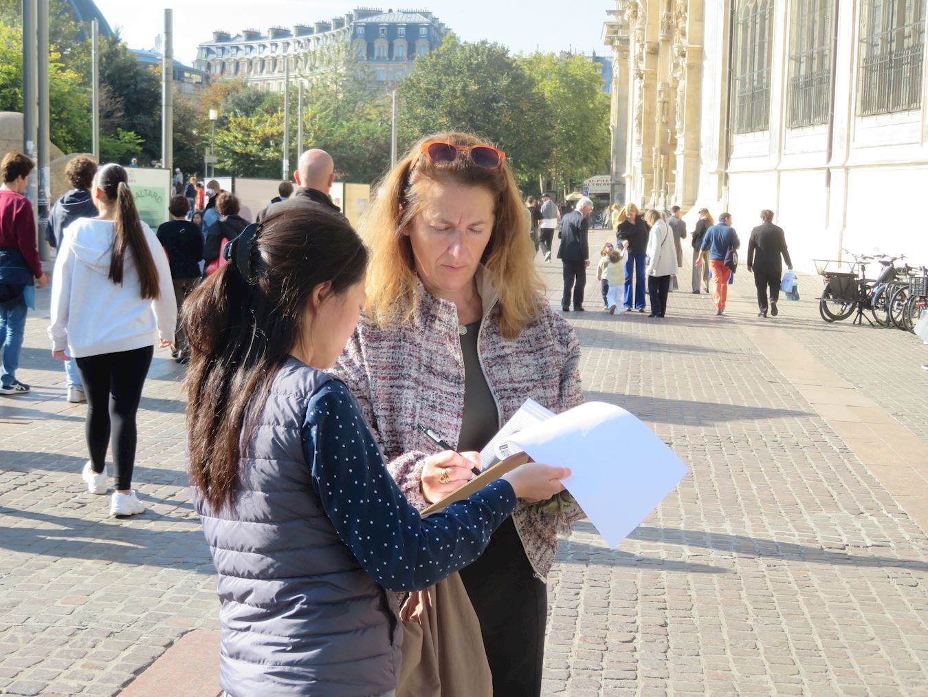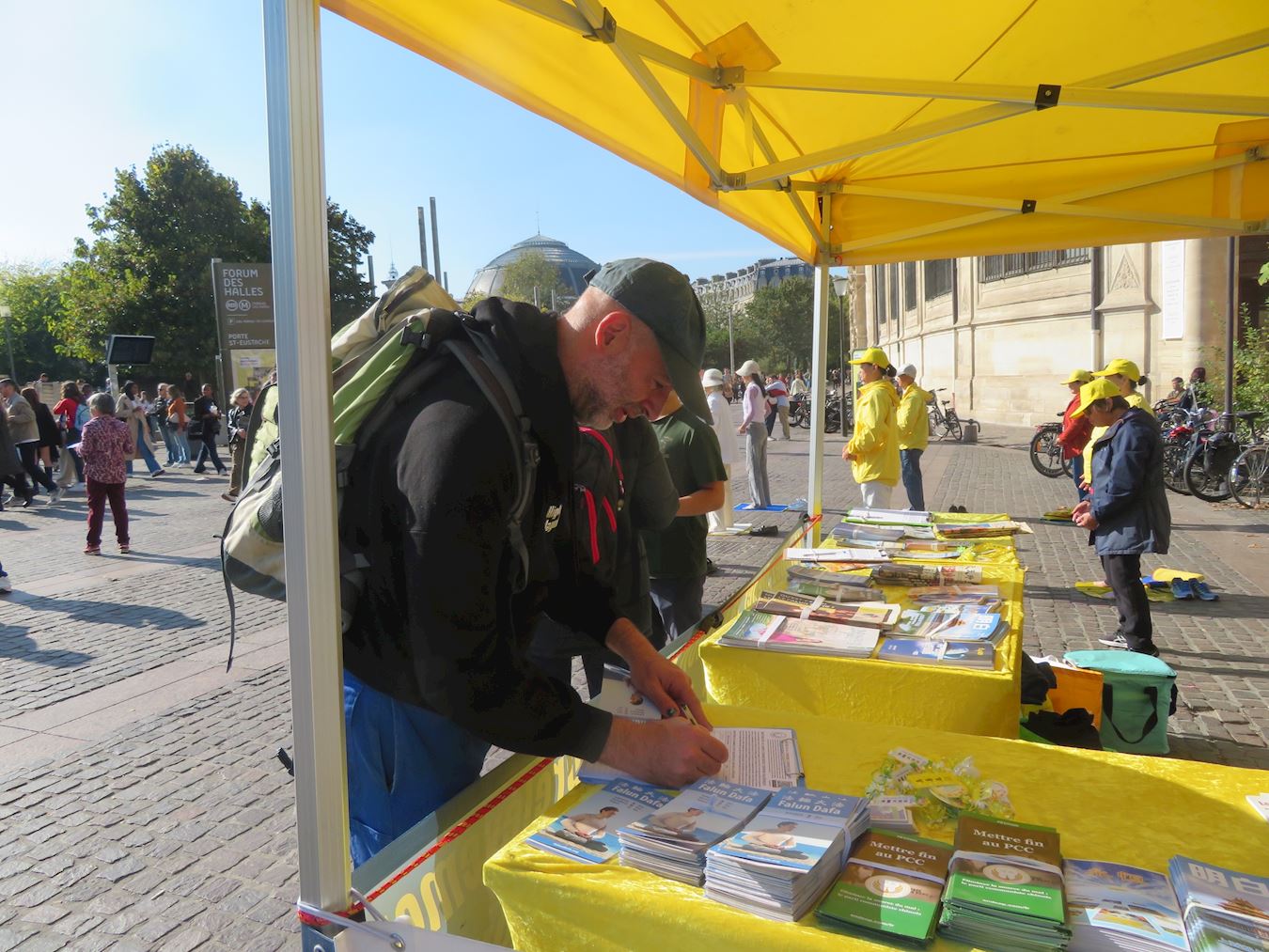 “我完全反对正在发生的对法轮功学员的迫害” 蒂博(Thibault)是高水平运动员教练,在泰国工作。他说,那里有很多修佛的人,他们也象法轮功学员这样打坐。他认为中共对法轮功学员的迫害很糟糕,甚至对他们进行活摘器官。法轮功学员告诉他,那是因为在一九九九年,法轮功炼功人数达到了一亿人,前中共党魁江泽民出于妒忌、害怕,发动了这场迫害。时间过去了二十六年,然而迫害法轮功没有停止。蒂博看着正炼功打坐的法轮功学员说:“我看他们(法轮功学员)对人没有什么危险,我完全反对正在发生的对法轮功学员的迫害。” 医学系大学生克丽娜(Crina)表示:“我们是人类,人不能对人做出活摘器官这样的事情,太恐怖了。希望和平降临人间,希望早日停止迫害。”她还认为,“真、善、忍是人类的准则,我们别无选择,我们必须遵守这些准则。”她鼓励法轮功学员坚持下去。 克罗蒂·勒鲁(Claudie Leureu)巴黎一所艺术学校工作。她认为中共的迫害不可思议,“要让人们(法轮功学员)安心生活。”她说:“全世界都要行动起来,不光在法国,全世界要联合起来,抵抗(中共)。不应有暴力,任凭这样的(活摘)行为是不正常的。”她认为法轮功学员的反迫害行动做得很好,必须这样做。 卡雷斯科(Caresco)女士是一地区的青年政策负责人。她说:“因为这个世界似乎正朝着一些不太令人愉快的方向发展,就象今天在中国发生的情况一样,对修炼法轮大法的人进行器官摘取。二零二五年的今天,这是完全不可接受的。” 亚历山大·维达尔(Alexandre Vidal)从事商业工作,当他得知中共对修炼真善忍的法轮功学员进行迫害甚至活摘他们的器官时,他愤慨道:“共产党是仇恨与暴力,它摧毁了人,摧毁了生活,扼杀了自由,夺走了生命。这违背了上帝的意志。这一切仍然存在,实在是不可接受。我们必须与此抗争。” 法国人赞美真、善、忍 十月七日,法轮功学员在巴黎美丽城进行了弘法和讲真相的活动。这里华人和中国人聚集,这天正好有集市,很多人前来了解真相,并想要学炼法轮功,索要巴黎炼功点的地址。  图8~9:十月七日,法轮功学员在巴黎美丽城进行了弘法和讲真相的活动。 |
